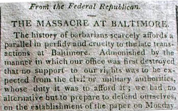 An August 1812 newspaper article describes the violence perpetrated by a large mob on two dozen political opponents attempting to distribute their newspaper in the city.
