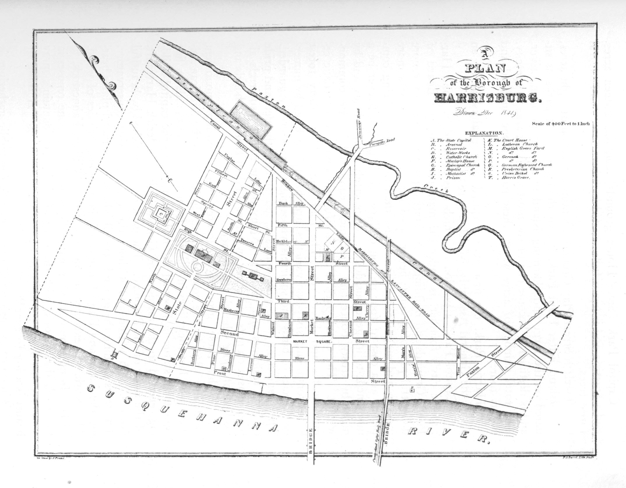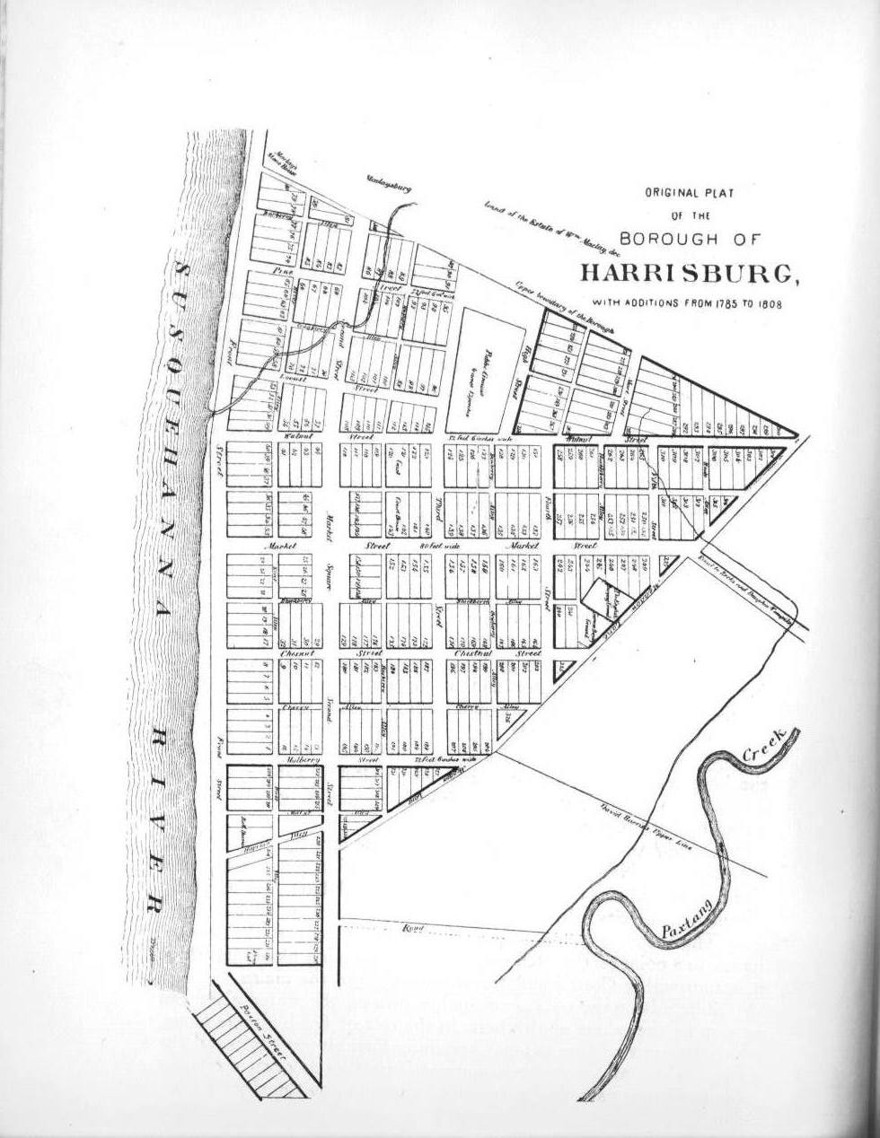 Paxton Creek and the Industrial CanalJust as the Susquehanna River defines the western boundaries of Harrisburg, two other waterways, one natural and one man-made, defined the town's eastern perimeter. Both played a significant role in the development of the town's African American community, and its subsequent anti-slavery activities. Paxton Creek is an important waterway that lent its name to the area when it was still a wilderness township of Lancaster County. John Harris settled near where the creek emptied into the Susquehanna River, a spot which was already a popular campsite for local Native Americans. As the town developed, the swampy lowlands surrounding the creek defied both farming and development, although the waterway did lend itself to use by tanneries, gristmills and sawmills. An old plat of the town shows the distinct lines of the town's eastern boundaries. with all of the intervening land sloping downward toward the creek. Because these sloped, often swampy areas were less desirable for building, they became the areas first inhabited by incoming African Americans in need of low-cost housing. The first significant area in which free African Americans clustered in Harrisburg was the block bordered by Third and Fourth streets and between Market and Walnut streets, situated on the northern limits of the town in 1810. Running east and west through the center of this block was Strawberry Alley, and it was bisected north to south by Dewberry Alley. From The Year of Jubilee: Men of God: